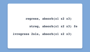 The areg, xtreg, fe, and ivregress 2sls commands now allow the absorb() option to be specified with multiple categorical variables. Previously, areg allowed only one variable in absorb(), while xtreg, fe and ivregress 2sls did not allow the option.